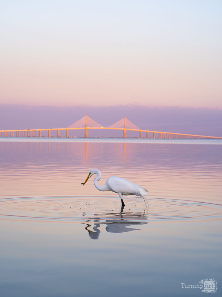 An Egrit grabs a snack during the blue hour at Fort De Soto beach near St Pete, Florida, with the Skyway Bridge in the background.