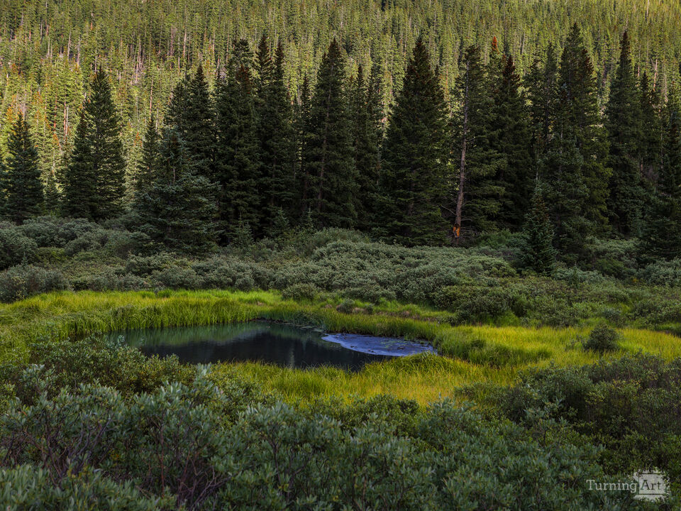 I loved the way the trees in the background were bathed in sunlight, but the foreground is in shade! The sun was getting low and I was hoping to capture a moose or two near this tarn, but not on this night! This area is usually where you can find moose because it's filled with water and swampy areas, which they love! I did capture a beautiful landscape though.