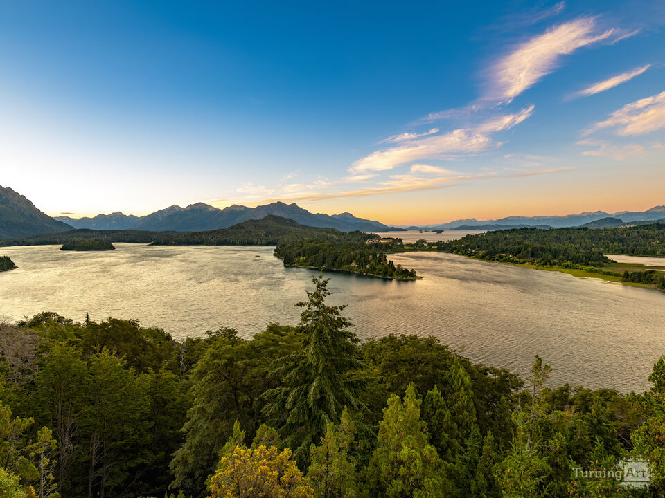 A panoramic landscape features a sunset sky over the mountainous horizon surrounding Lago Moreno and Lago Nahuel Huapi in Llao Llao, San Carlos de Bariloche.