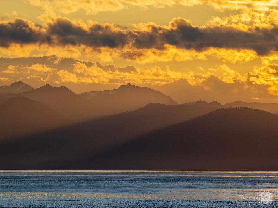 A scenic view of the Alaskan coast captures a vibrant sunrise casting a warm glow over the silhouetted mountains of the Inside Passage. Rays of light pierce through the clouds, creating a dramatic and tranquil scene above the calm waters. The sky is painted in hues of orange and gold, contrasting beautifully with the serene blue of the sea.