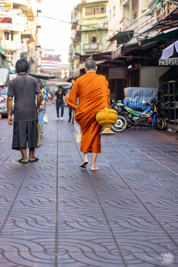 Captured in 2023 in Bangkok’s Sampeng Market, this photo shows a Buddhist monk walking barefoot through the narrow streets shortly after dawn. He carries an alms bowl, used to receive food offerings from locals as part of a daily tradition rooted in humility and community. Amid the clutter of early-morning commerce, this quiet moment reflects the enduring presence of spiritual practice in everyday Thai life.