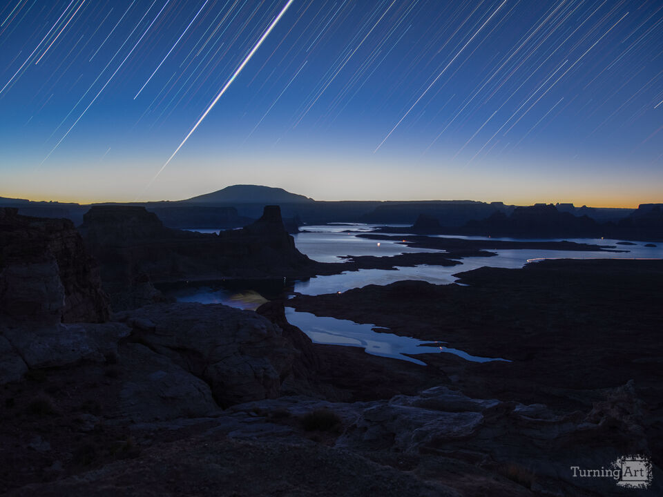 A shower of stars fades into blue hour before sunrise at Alstrom Point, Utah