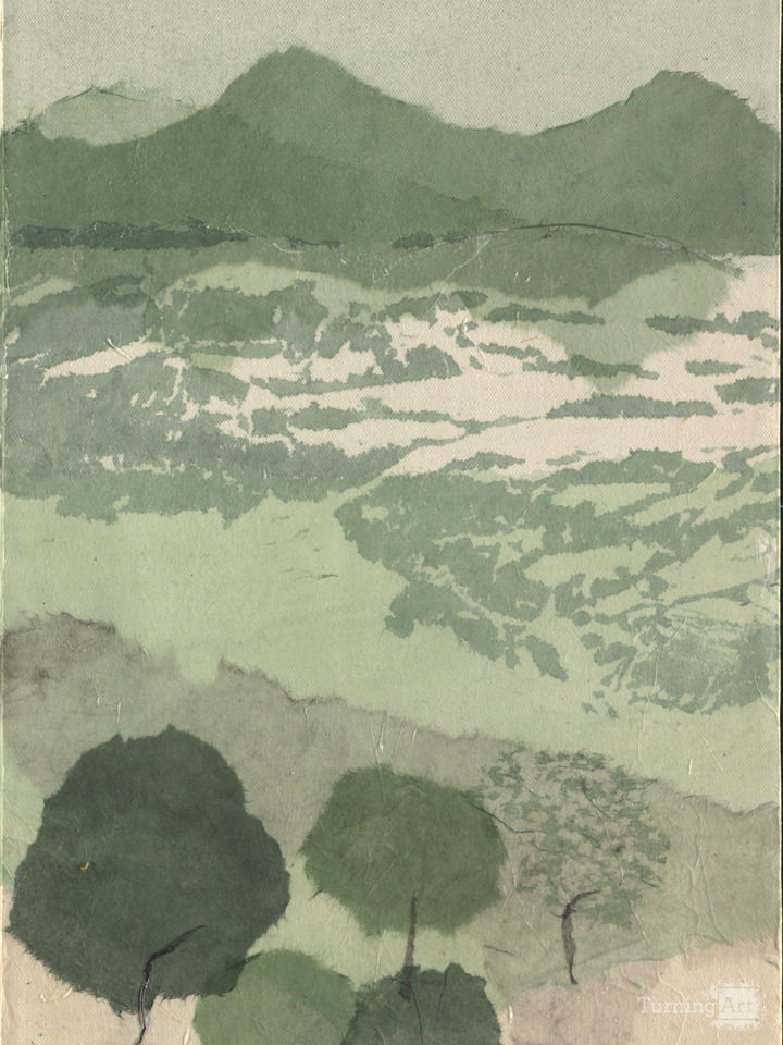 I painted the Japanese handmade Washi paper with several different painting and hand printing techniques to achieve the depth and distance.