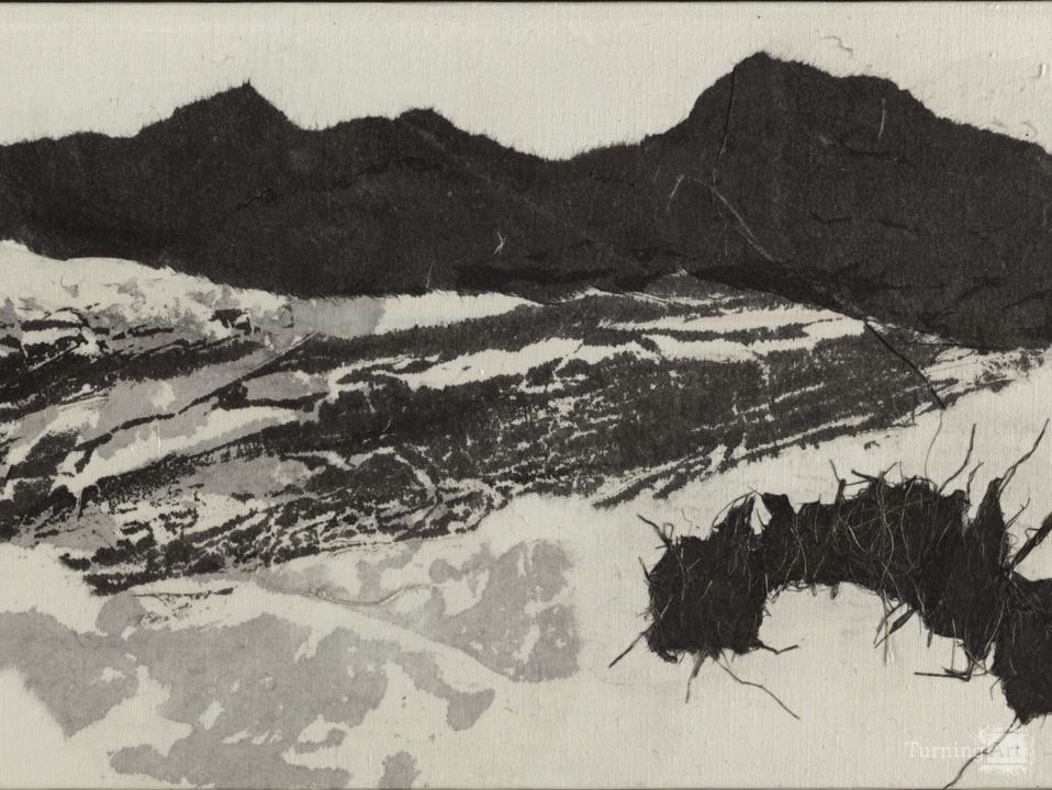 This studio canvas has Japanese handmade Washi paper covering it entirely showing depth and distance.