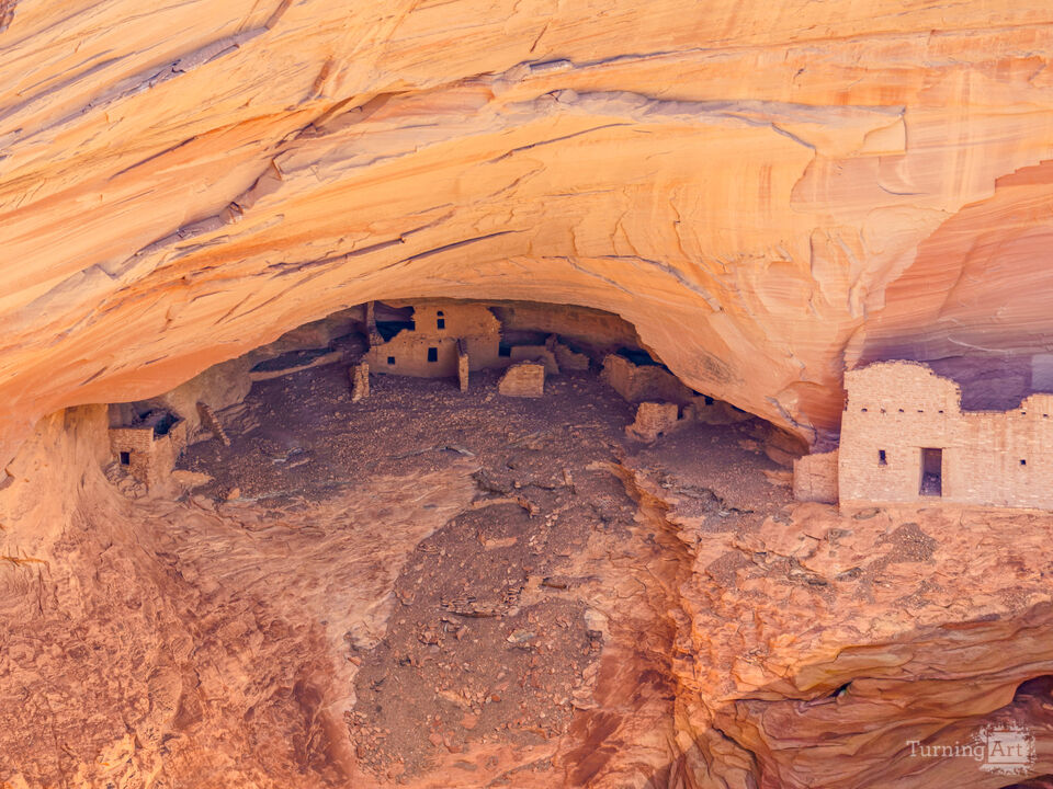 Located at Mummy Cave, this historic cliff dwelling once held the thriving life of the Ancestral Puebloans (formerly called Anasazi) during the 13th and 14th centuries. This perspective reveals additional clusters of rooms and partial walls tucked deeper into the alcove, giving a clearer sense of how the settlement expanded along the natural curve of the canyon wall.