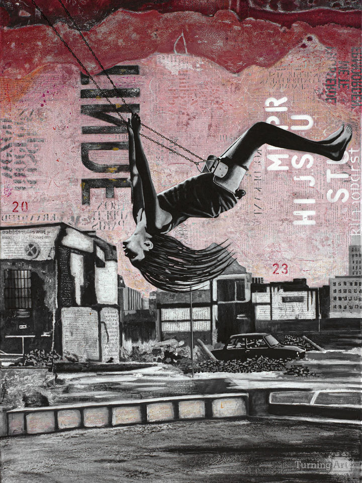 A girl is having fun on a swing, against the background of the demolition of the city where she was born. An industrial city with old dilapidated buildings being demolished to make way for modern industry, the Philips buildings in Eindhoven, Netherlands.