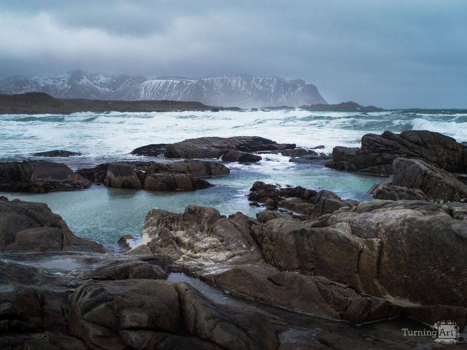 Skagsanden Beach in the Lofoten Archipelago, Norway. The beach is filled with these little tidal pools that create their own mini-landscapes.