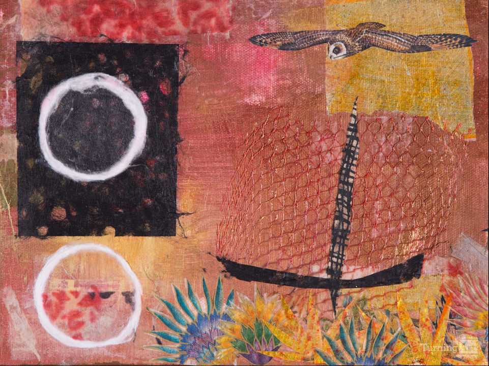 She continues to work in collage and mixed media. The same aesthetic is common in all: repetition of elements, a keen interest in pattern, and usage of vibrant colors. The presentation is refined, the work is designed to quiet and center the viewer, and serve as an antidote to our over-stimulated culture. It is work designed for meditation, a brief respite, a place to rest. New work in fiber includes rust printed fabrics, stitched with metallic threads and embellished with beads and sequins.