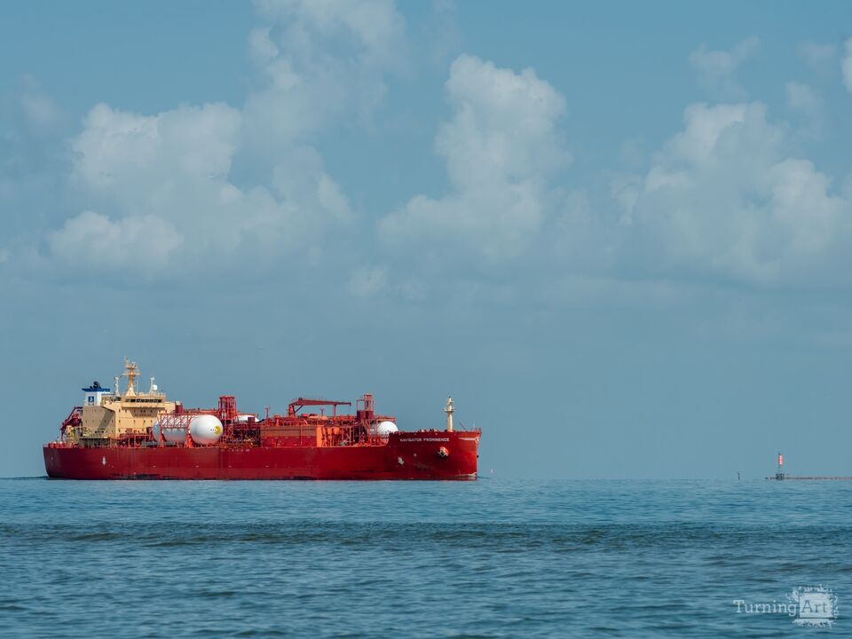 NAVIGATOR PROMINENCE, a tanker ship sailing under the flag of Liberia, traverses the Houston Ship Channel near Galveston, TX. The ship channel connects the Gulf of Mexico to the various terminals comprising the Port of Houston. The image is from the artist’s book “Waterline: Photographs at the Houston Ship Channel.” (SN 250814A0534)