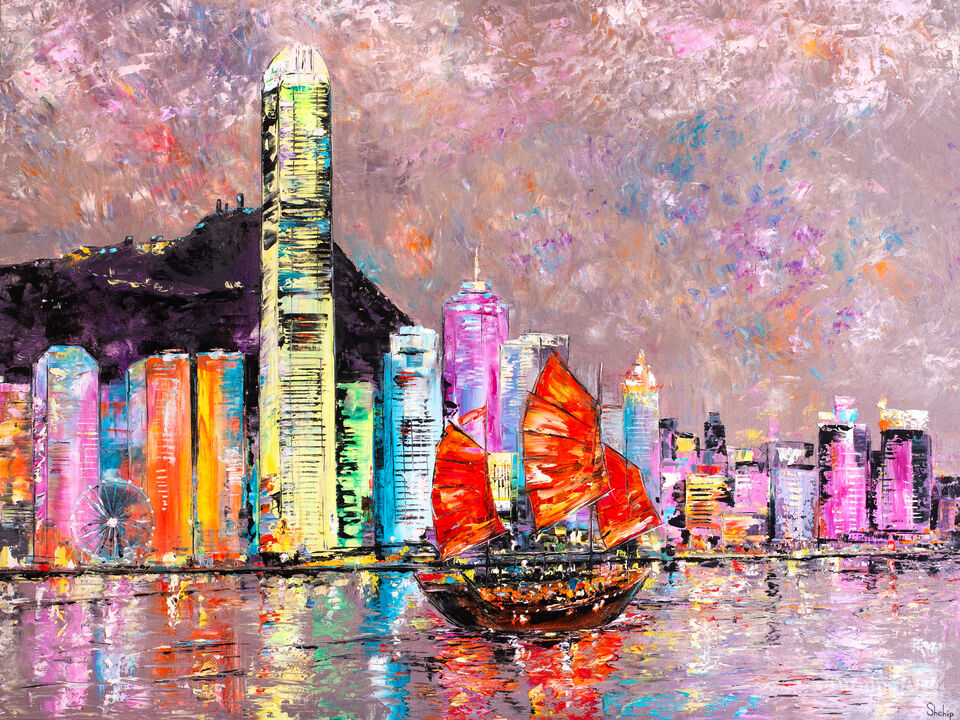 A glowing Chinese junk boat drifts across Victoria Harbour, its red sails catching the reflections of Hong Kong’s electric skyline. The scene merges old and new — traditional seafaring culture sailing beside futuristic towers lit in bold neon hues. The brushstrokes are vivid and textured, giving the water a sense of movement and the sky a surreal, dreamlike atmosphere. This is a portrait of contrast: a timeless harbor at the edge of a restless, modern city. Oil, canvas. Signed. Varnished.