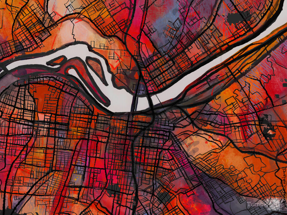 “Louisville, Kentucky” is a vibrant abstract map that captures the city’s dynamic rhythm through an expressive interplay of orange, pink, and gray. The warm tones of coral and tangerine evoke Louisville’s creative spirit and southern charm, while soft grays ground the composition with a sense of architectural structure and flow. Inspired by the city’s iconic riverfront and historic neighborhoods, this piece blends cartographic precision with painterly movement, transforming the urban landscape into a radiant visual symphony of color and form.