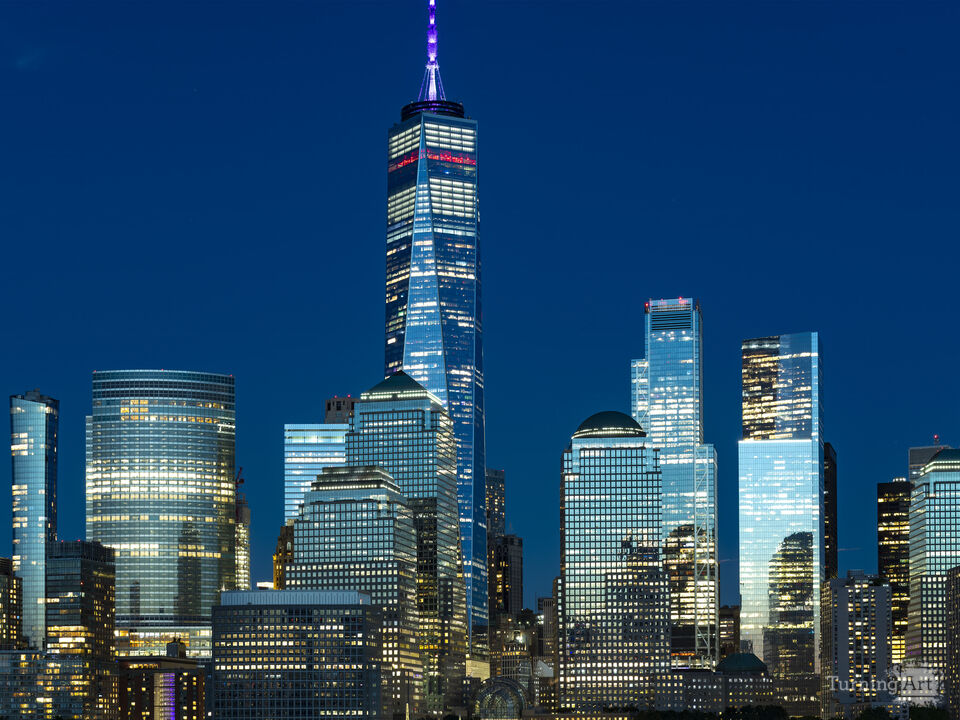 Bright city lights and glass facades of the Financial District reflect against the deep blue night sky in New York City.