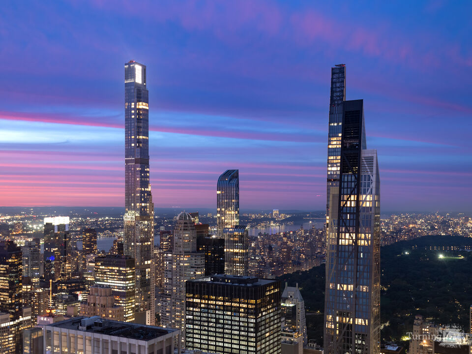 The dramatic verticality of New York City Billionaires Row towers illuminated against a vibrant evening sky, with the urban sprawl extending below.