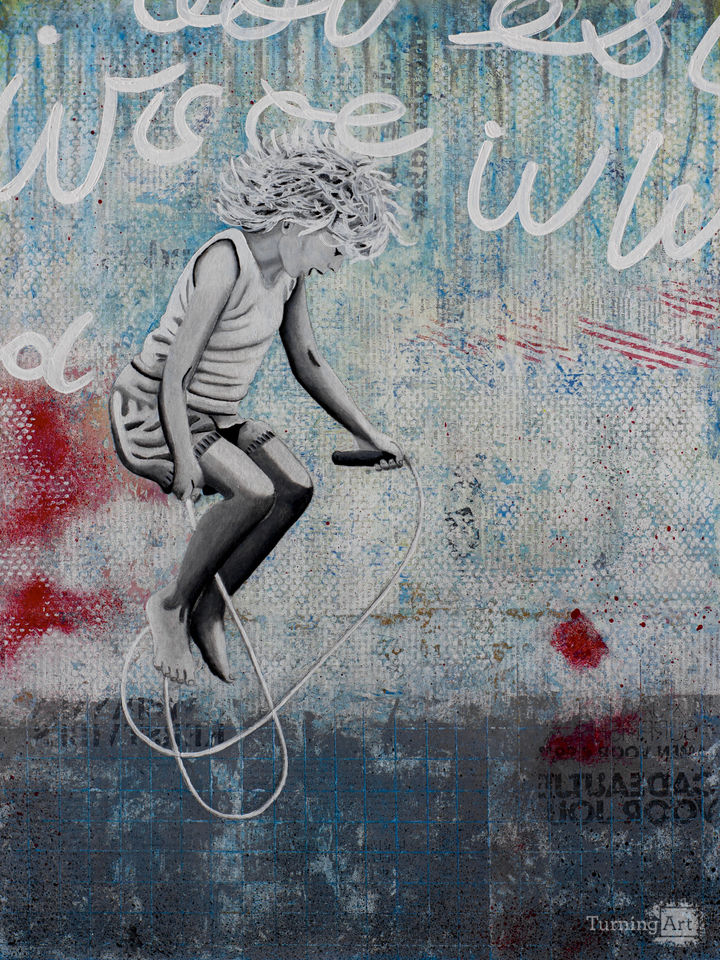 Urban and graffiti scene of a girl with her skipping rope against a light blue background with large white letters.