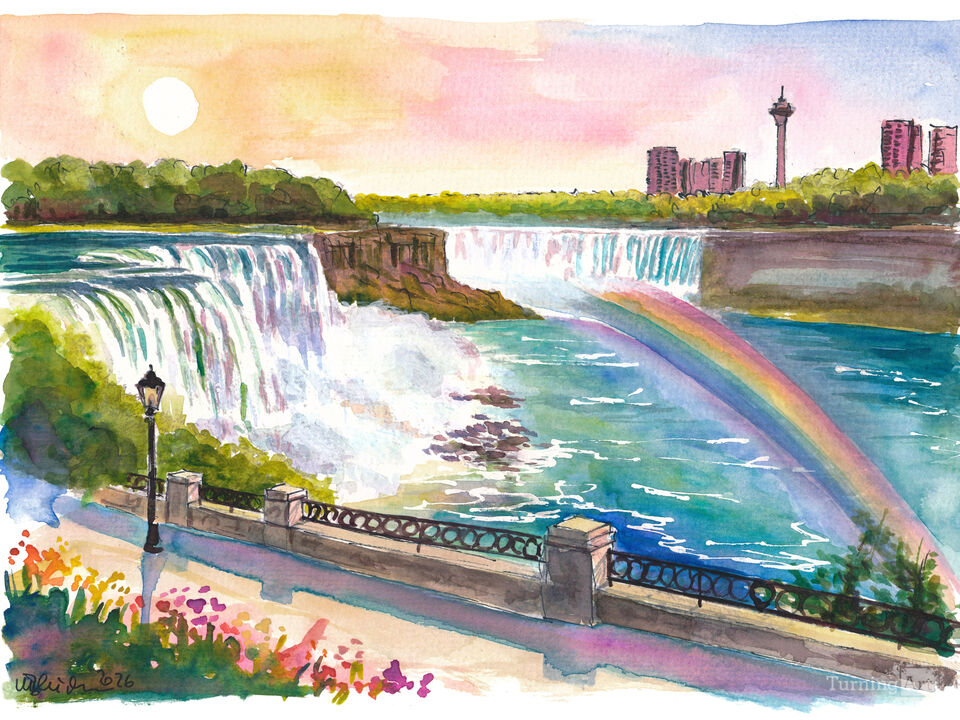 A dramatic waterfall landscape inspired by the iconic Niagara Falls, where powerful cascading water meets sunlight to create a vibrant rainbow above the mist. The composition captures the awe-inspiring scale and natural beauty of one of the world’s most famous waterfalls.