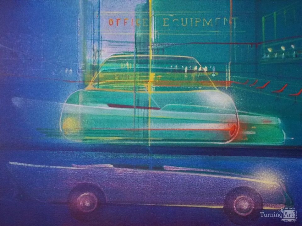 Part of a series of reflections in windows at night. This is linked to themes of cars and the city and posing the question of what do you see when you visit a city. The dominant themes that emerge are cars, reflections, architecture, tourists; and the paintings attempt to try and depict these themes pictorially.