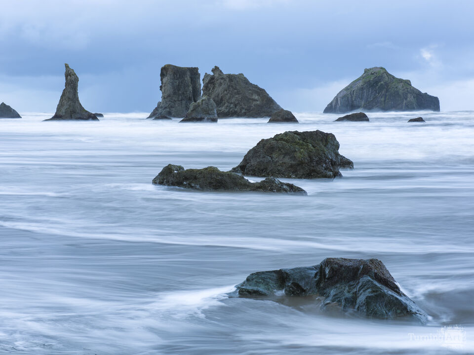 Cool ocean blues in dawn light: a convergence of dramatic sea stacks and perpetual surf. Pacific Coast, Bandon Beach, Oregon.