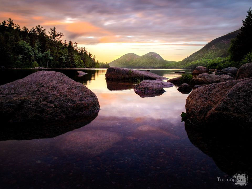 The Bubbles reflect in Jordan Pond in Acadia National Park, Maine, USA.