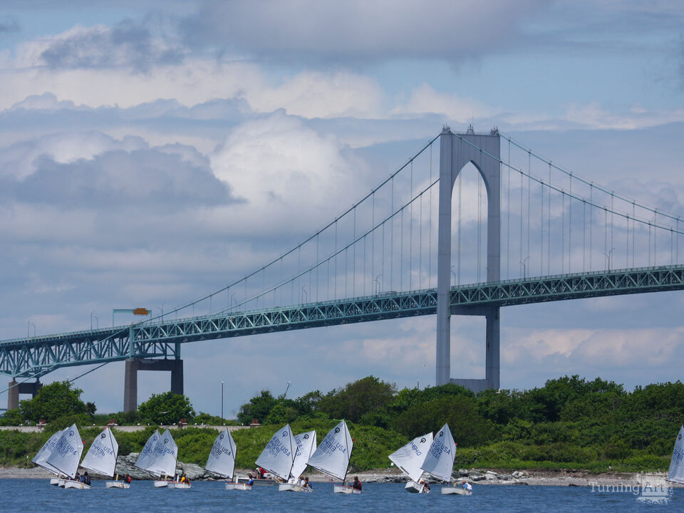 A fleet of Optimist dinghies sails across Newport Harbor beneath the sweeping span of the Claiborne Pell Newport Bridge. The small training boats are piloted by young sailors learning the fundamentals of racing and seamanship. Their bright white sails stand out against the blue water and the dramatic architecture of the bridge in the background. Newport has long been known as one of the great sailing capitals of the world, hosting regattas of every level. The scene captures a moment of youth sailing in one of America’s most historic maritime settings. It reflects both the beauty of Newport Harbor and the future of the sport.