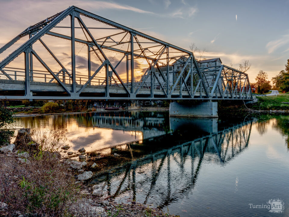 A vivid autumn sunset settles over the historic truss bridge and the beautifully restored Ozark Mill along the Finley River in Ozark, Missouri, USA. Built in the early 1800s, the mill originally served as a vital gristmill for the surrounding Ozarks community, using the steady flow of the Finley River to grind grain for local families and farmers. I captured this during the fall season with bold orange and amber hues highlighting the sky and reflect across the calm water below, creating a mirror-like reflection of the bridge and mill. Renovated in 2021 and thoughtfully transformed into a restaurant, the Ozark Mill preserves its original architecture both inside and out, blending early Missouri history with the timeless beauty of this peaceful riverside scene.
