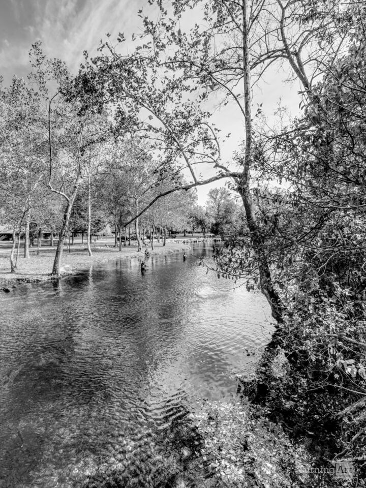 A black and white photograph of a peaceful autumn afternoon view from the gauge house at Bennett Spring State Park in Bennett Springs, Missouri. Fly fishermen stand in the crystal-clear spring water, casting for trout as a graceful river birch tree arches out over the river like natural artwork. Behind them, trees line the riverbank in classic Ozarks fashion. Located near Lebanon, this historic state park is one of Missouri’s oldest and is famous for producing nearly 100 million gallons of fresh spring water every day.