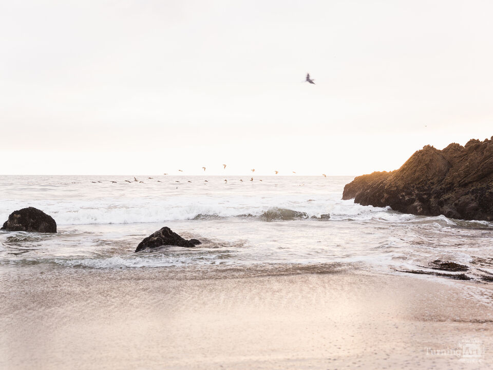 A flock of birds flying over the ocean at sunset at Leo Carrillo beach in Malibu, California.