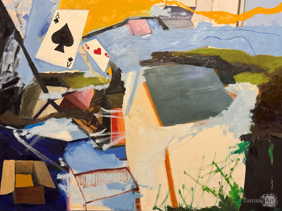 "Pack" shows architecture flooding and slipping away, Playing cards fall from the sky, suggesting that the game is up; planning and dreams of success have gone awry.