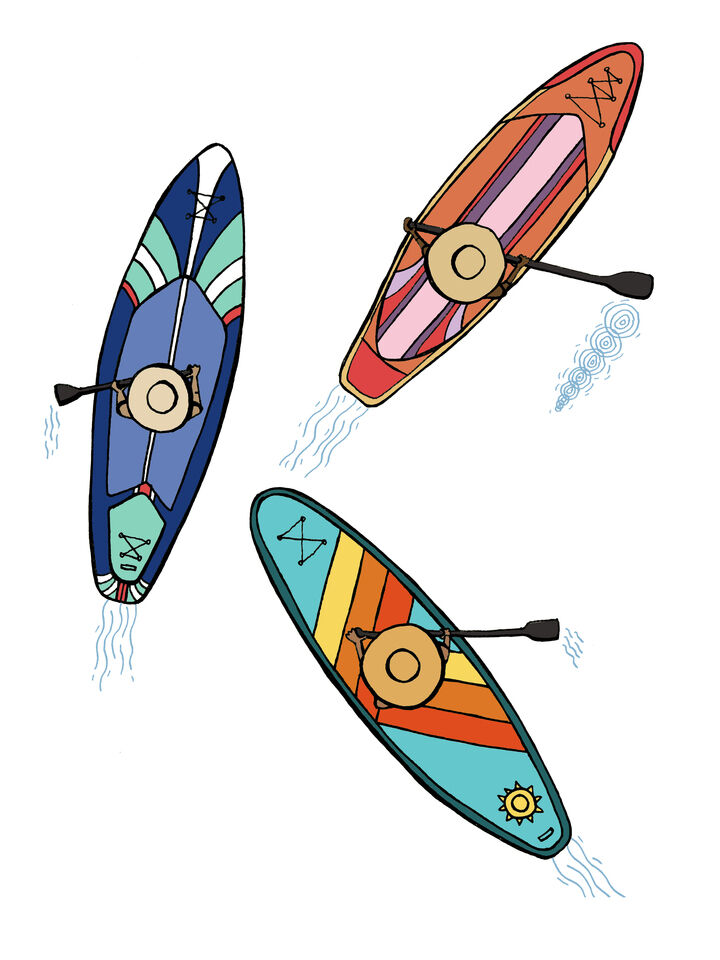 A colorful trio of paddleboarders skim through the waters as seen from above.