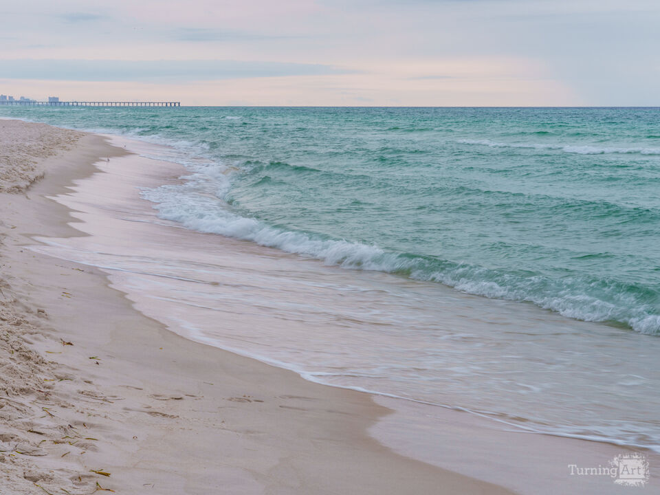 In the faint distance, the M.B. Miller County Pier stands alongside a row of beachfront hotels and condos. Along the water’s edge, a few sanderling birds scurry across the sand in search of breakfast. As the waves wash ashore, they leave behind delicate white foam that adds texture to the smooth, reflective wet sand, an idyllic way to begin the day along the Gulf of Mexico on Florida’s Emerald Coast.