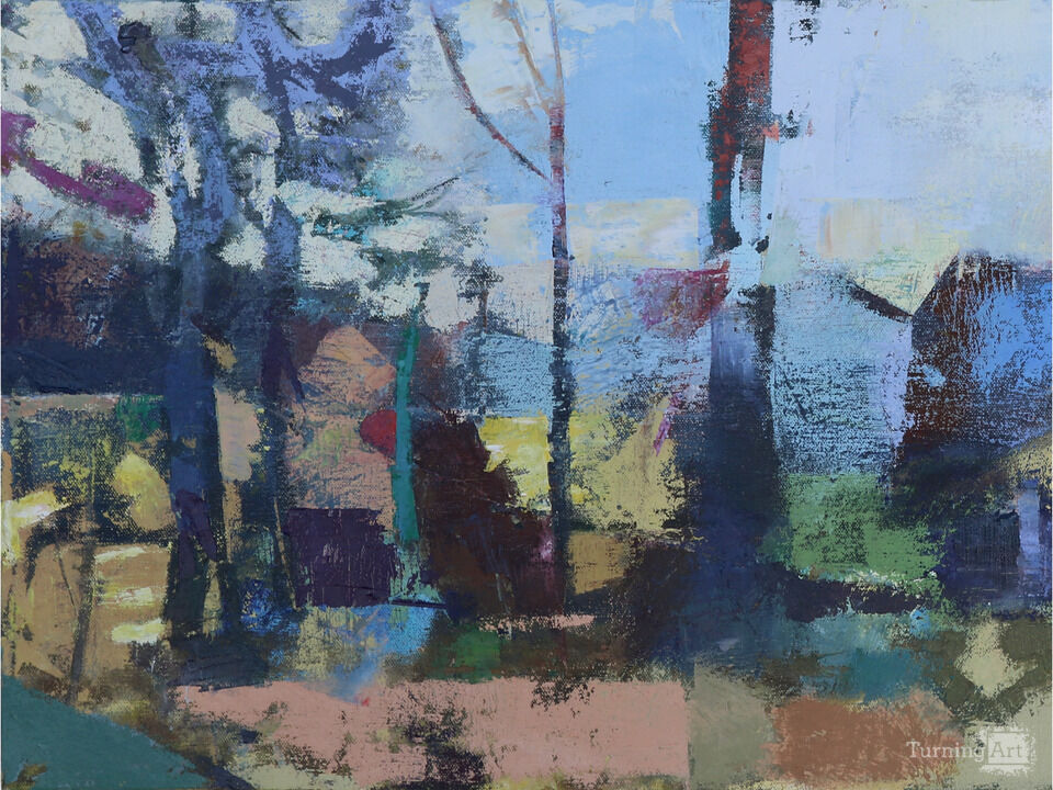 This is a detail of a larger work featuring a patchwork of expressive form and color that borders on pure abstraction. Originally based on a view of a reservoir west of the city I live near, it followed a familiar process of realism, over-painting with new visual ideas to a resolution with much a more vibrant and abstract approach to the subject.