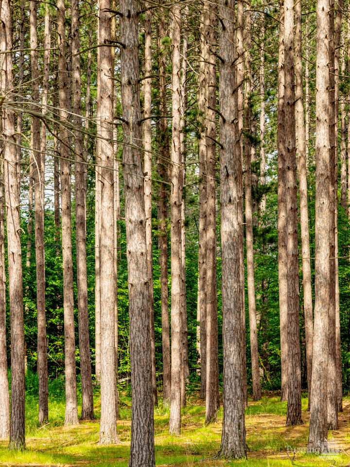 This photograph captures a another scene of tall, slender pine trees at a rest stop in Michigan, focusing on the vertical lines and natural rhythm of the forest. Sunlight filters through the canopy casting soft highlights and shadows across the textured bark, which accentuates the trees’ height and rugged character.