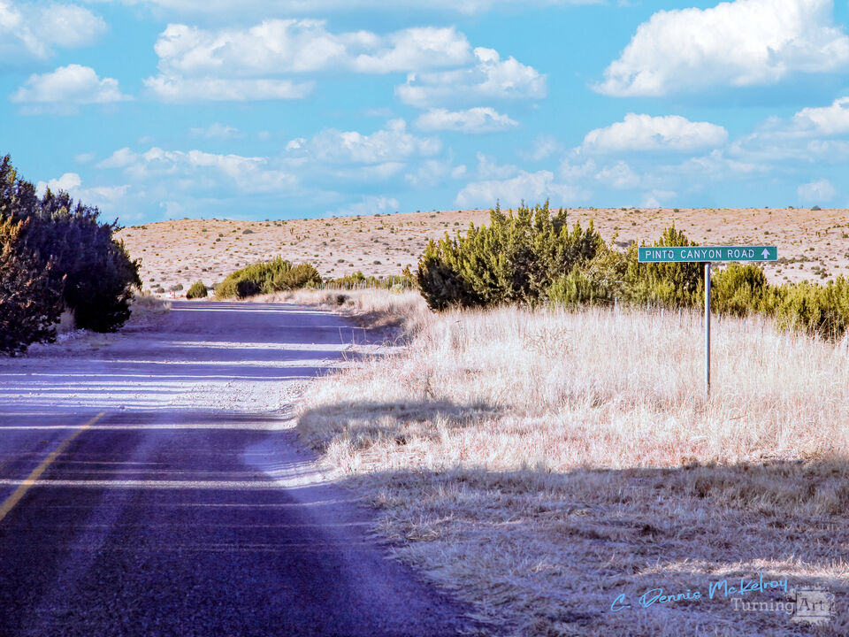Pinto Canyon is at the bottom of one of the steepest road inclines in Texas and it is gravel. The road goes down into the canyon to a small creek and little pond. There are hot springs in this area as well. It is a tranquil place where one can step out and take a break.