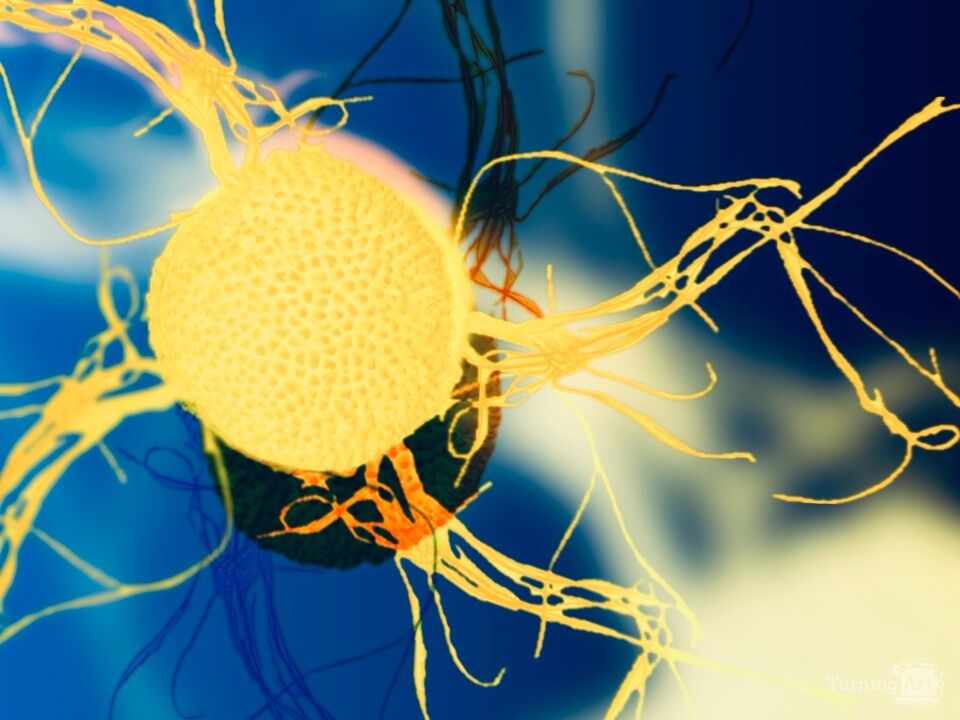A composite portrait, from original photography and graphic layers, of the sun's plasma. There's a cellular and solar crossover as plasma is both astronomical and biological, although in different forms. This piece is also an extension of the specimens series: The subject of the central photo is a sycamore seed pod, the texture of which strikingly resemble the granular surface of the sun. There's a combination of viewpoints and methods, including 'stereopticon' here to give the impression of a plasmoid or "coherent, magnetic-field-constrained blobs of solar plasma."