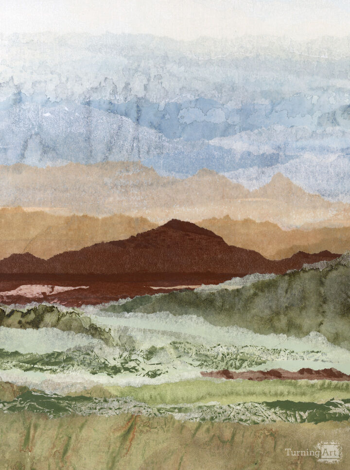 "Plateau Mirage" captures the enchanting warmth of a desert landscape through layers of acrylic paint, ink and translucent wax papers. Escape to a place where burnt sienna, sage, and earthy tones blend beneath a sweeping sky. Inspired by the rustic color palette and textured beauty of southwestern terrain, this piece invites viewers into a serene space where land and sky meet in perfect harmony. An alternate landscape orientation of this print is available.
