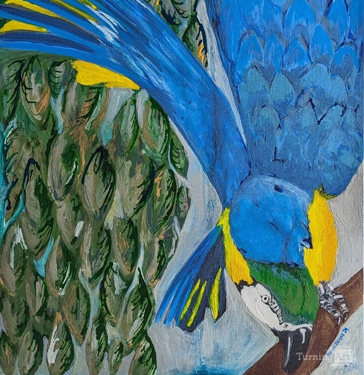 Jeanne has always painted Macaws. This is a rare version in mixed media on canvas. Jeanne used acrylic paint, watercolor and ink. The bird was standing on her arm, bobbing up and down when she caught the image with her camera.