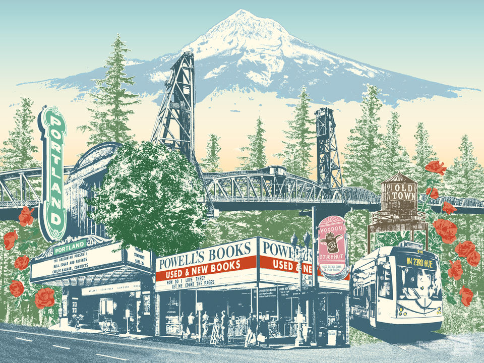 All the quintessential icons of Portland packed into one print – Mt. Hood, Powell's Bookstore, Hawthorne Bridge, Schnitzer Hall, Voodoo Doughnuts, the Old Town Water Tower, and the Streetcar that can take you everywhere. Lastly, it is highlighted with Roses…the beautiful flower that grows so easily here in "The Rose City". It has so many of the most famous Landmarks in Portland, all in full color…it was named, "Portlandmark". The color palette of this piece is inspired by vintage postcards from the 1940's to create an even more nostalgic feeling.