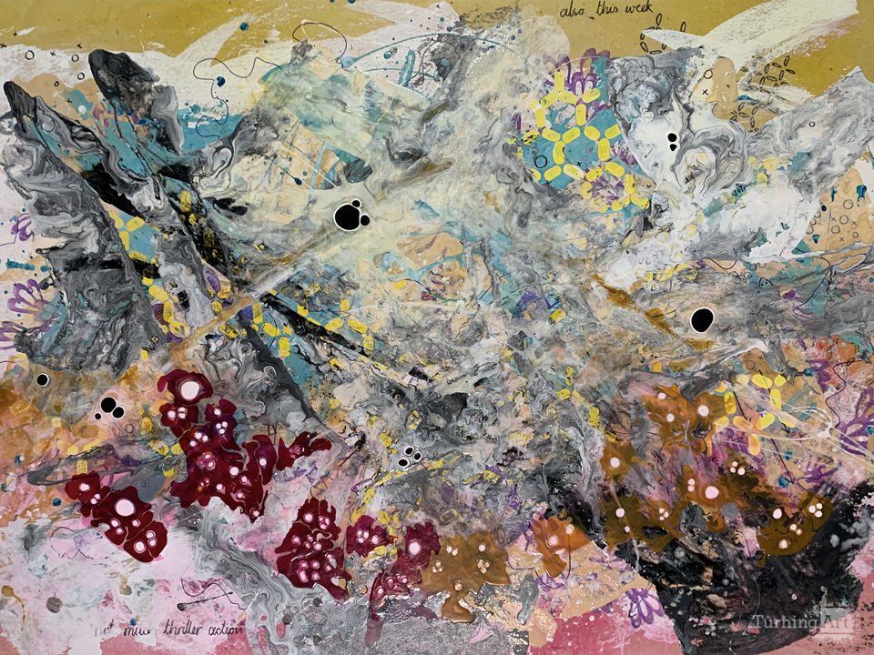The little bits of writing around the edges of the painting read "not much thriller action," "the impulse to capture everything," and "also this week." which were probably taken from an audiobook rendition of one of Terence McKenna's books on the psychedelic experience.