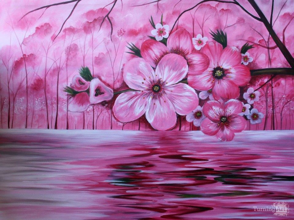 Pink blossoms next to serene waters are a pretty picture to behold.