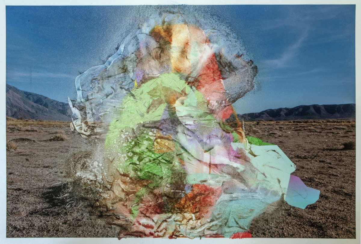 From the "Through the Prism" Series: Landscape images mixed with digital color forms are printed so the digital color areas are able to be smeared/painted. On a sheet of cotton rag paper, I spray acrylic medium onto it to allow the ink to sit on the surface. The ink can be manipulated for a while before it dries.