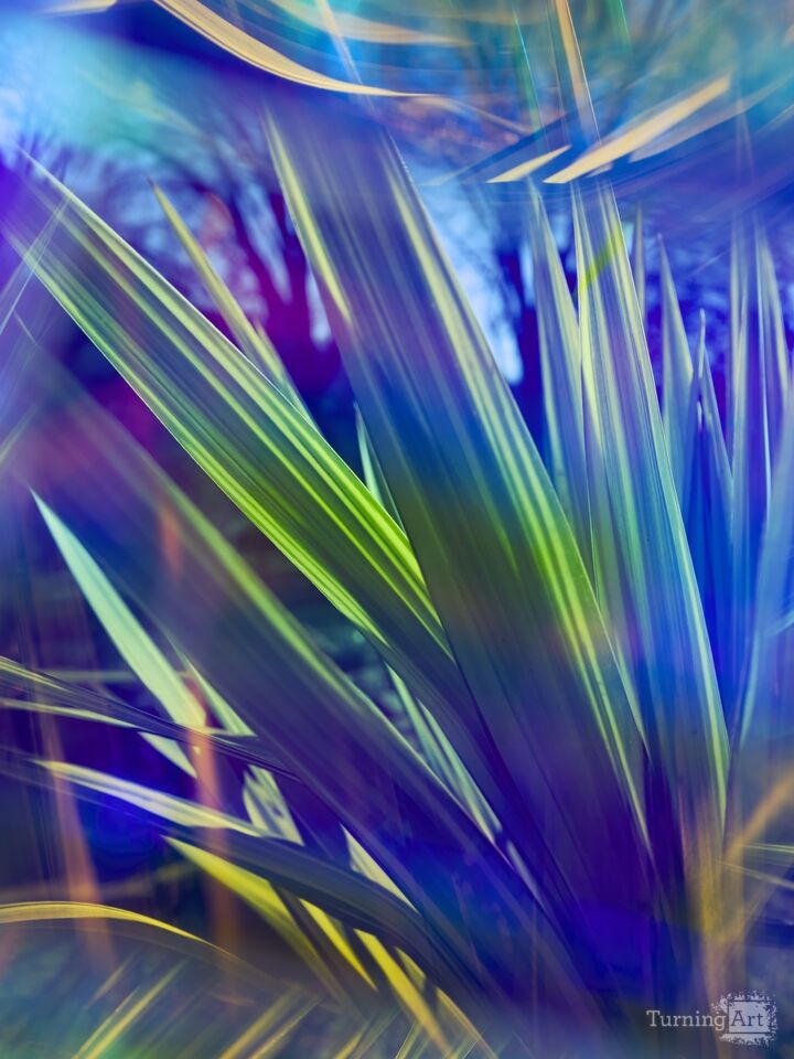 This prismatic photograph of a sentry plant captures the plant’s tall, slender leaves in a vibrant, dynamic display, their green tones electrified by a striking mix of blues, purples, and yellows. The prismatic effect creates a shimmering, almost translucent glow, making the leaves appear to pulse with energy against a swirling, colorful backdrop. The background, a vivid blend of pinks and blues, adds a sense of motion and depth, enhancing the plant’s upright form with a lively, almost radiant vibe. The interplay of light and color infuses the scene with a spirited buzz, as if the sentry plant is thriving in a vibrant, prismatic garden.