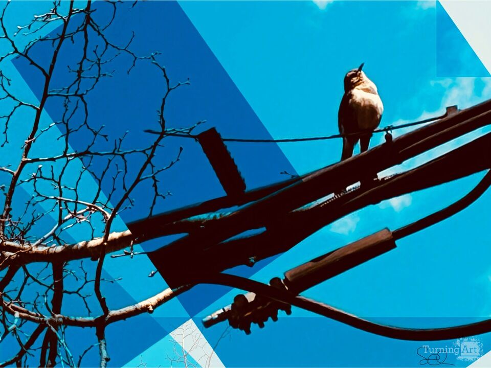 An exuberant, mythological portrait of the singing Mockingbird in Spring that celebrates animal sentience and the remarkable adaptation of birds. It expresses the overlap of technology and nature, and that all creatures share the same environment.