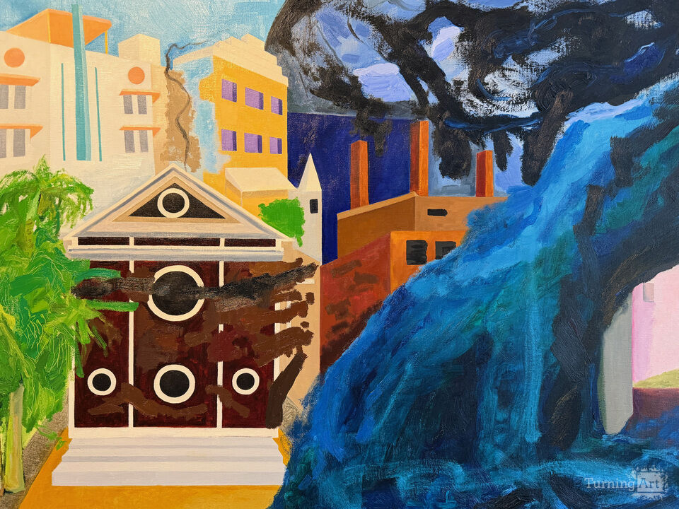 Providence Miami and Weather depicts the Art Deco architecture of Miami and the historic architecture and factories of Providence, Rhode Island, in one landscape. Palm trees and flooding collide as the veneer of tourism faces cataclysmic storms.