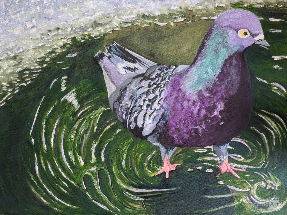 This whimsical painting of a pigeon walking through a puddle in Central Park has an almost illustrative look. The colors are bold, and some are metallic. The water reflects the park's greenery. The painting is watercolor and acrylic ink on paper adhered to canvas. It would make a bold addition to any collection.