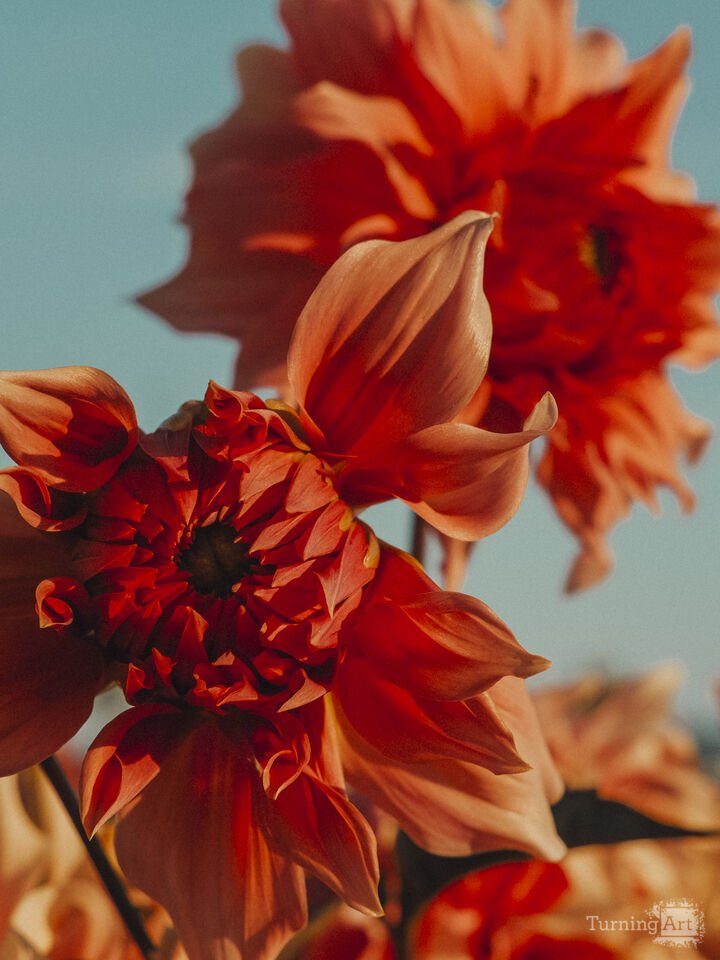 A happy colorful botanical photograph of pumpkin colored dahlia flowers blooming in an Autumn garden.