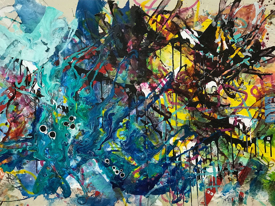 This painting also includes layers of poured paint, bright patches of heavy body acrylic paint smeared in thick striped of primary yellow and red, doodles in brightly colored Krink brand paint markers, and paint applied in carefully controlled dripping processes.