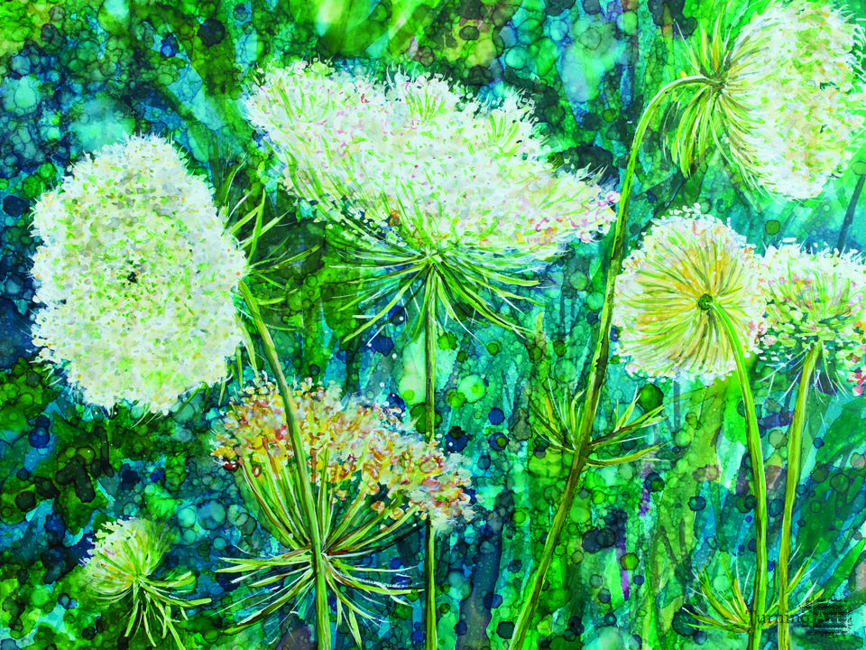 Delicate Queen Anne's Lace flowers against a dark blue and green foliage background. I painted this outdoors on a sunny day with alcohol inks and watercolor paints on an Ampersand Claybord panel.