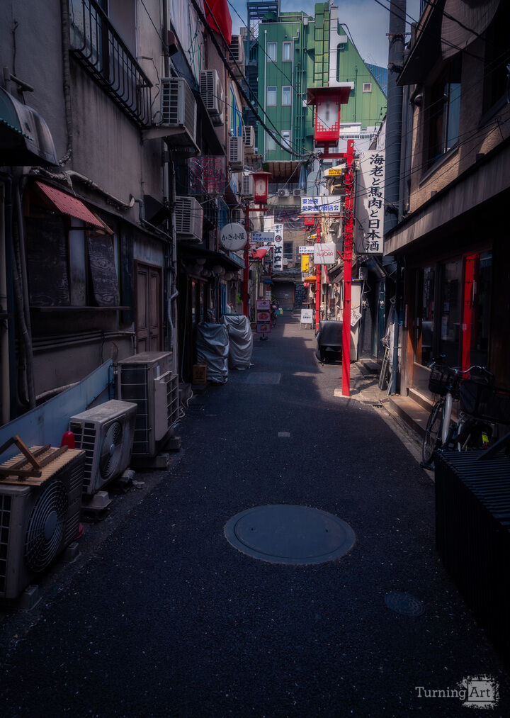 A peaceful alley in Tokyo contrasts the towering business buildings with cozy local bars and traditional facades.