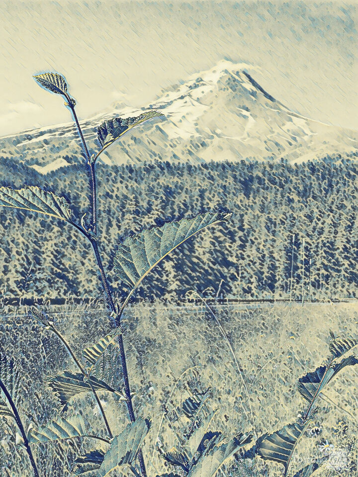 This beautifully textured artwork "Rain On Mount Hood 4822" shows a lovely meadow and forest, with views of Oregon's Mount Hood on a rainy day. The landscape is full of details. The color palette is calming, in shades of blue, the brush-stroke is soft. The topic brings the viewer into relaxing, rejuvenating outdoors. These artworks print up to 70 inches tall, and larger upon special request. Find more art in this style to create art-groupings in your space.