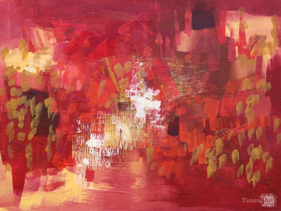Heartbeats and Butterflies is a purely abstract painting with a balance of cool and warm reds, each contributing to the overall harmony and unity of the artwork. With different sizes and shapes of brushes and heavy bodied and flow acrylics I established large and small shapes, inciting the eye, and creating interest.