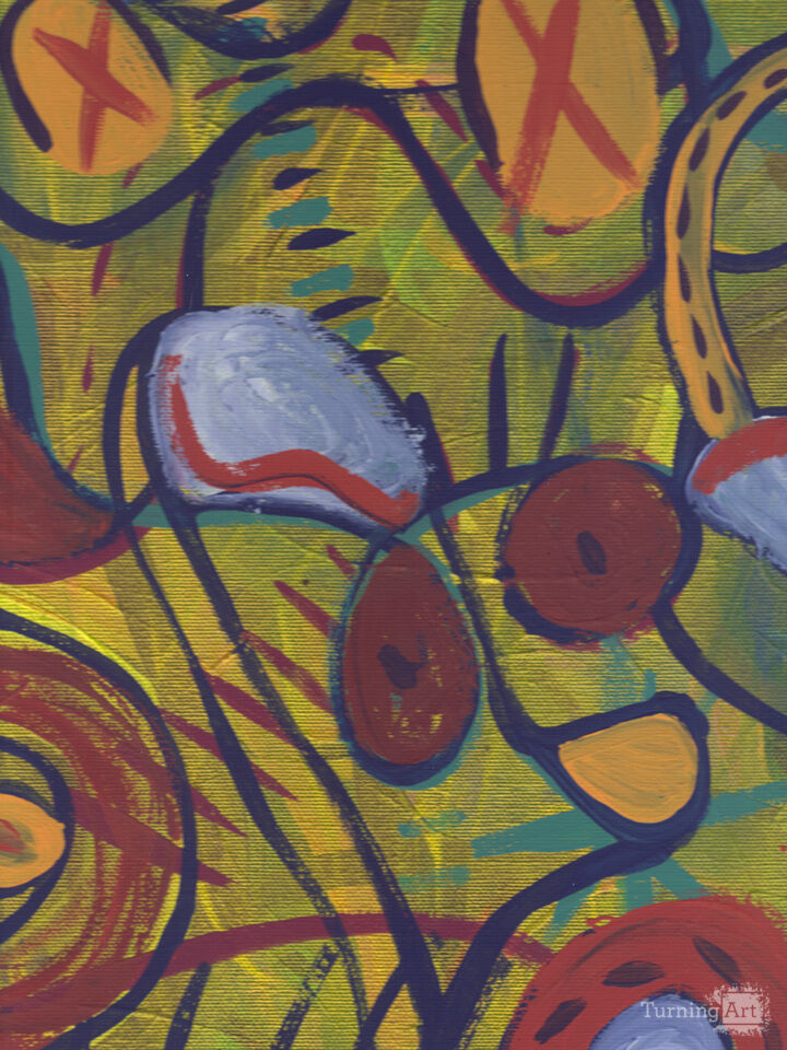 I had done some initial brushwork on the piece, then covered the entire painting with transparent gold paint, then added the shapes using dark blue outlines, and filled in a few of those shapes with different colors